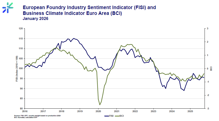 The European foundry industry has begun a new year of 2026 with a slight correction of the European Foundry Industry Sentiment Index (FISI), published monthly by European Foundry Federation, which decreased by 0.3 point in January 2026 and reached a level of 95.5 points.